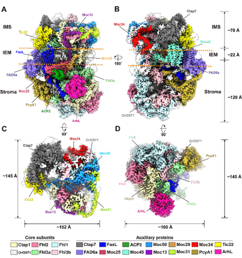 研究发现,Orf2971-FtsHi是由19个蛋白形成的一个20个亚基的复合物,横跨叶绿体的内膜,并向两侧凸出到叶绿体膜间隙以及基质侧。其中,Orf2971是一个由叶绿体质体基因组编码的蛋白,总分子量约为341 kDa,在进化层面上起源于FtsH蛋白酶。而该蛋白在复合物中充当支架,与另外19个蛋白亚基中的17个均有直接相互作用,对整个复合物的组装和稳定至关重要。同时,复合物的另外4个蛋白即Ctap1、Fhl1、Fhl2及Fhl3与FtsH蛋白酶同源。结构显示,这5个FtsH样蛋白共同形成一个类似于双层圆盘的异源六聚体结构,通过水解消耗ATP分子为前体蛋白的跨膜转运提供拉力;其余14个蛋白亚基发挥帮助复合物组装与稳定以及参与前体蛋白的运输及调节的作用。