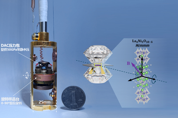 自双层RP镍酸盐La3Ni2O7-δ在高压下被发现具有近80 K的超导温度以来,三层同体系La4Ni3O10-δ单晶在压力下也被证实存在体超导性。上临界磁场作为超导体的基本参数之一,对理解超导配对机制至关重要。然而,要完整测量RP镍酸盐的上临界磁场并表征其各向异性,在技术上具有挑战性。此外,由于水冷磁体的内部空间有限,传统技术无法实现高压腔在强磁场中的原位旋转,而这恰恰是测量上临界场各向异性的关键所在。